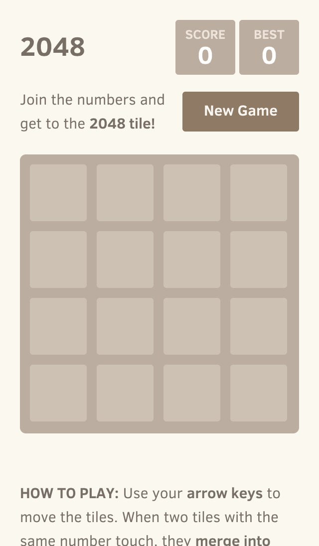 How to play: Use your arrow keys to move the tiles. When two tiles with the same number touch, they merge into one!